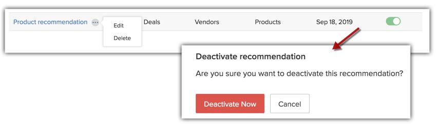 Poți edita, șterge sau dezactiva un model oricând este necesar. Sub tab-ul Builder din recomandare, poți vizualiza toate modelele care au fost create. Poți plasa cursorul pe un model și apăsa pe pictograma mai multe pentru a Edita sau Șterge un model. Similar, poți dezactiva un model folosind comutatorul.