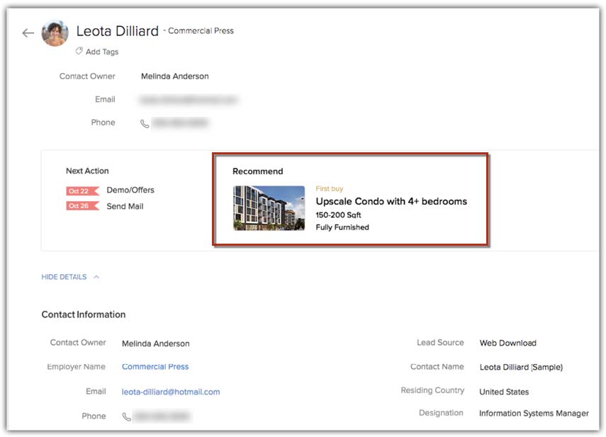 - Selectarea modulului țintă : Modulul care conține informațiile utilizatorului final sau ale clientului este modulul țintă. Poate fi un modul standard sau personalizat. De exemplu, dacă dorești să recomanzi cursuri pentru clienți, lead-uri sau contacte, informațiile acestora trebuie să fie în modulul țintă. Totuși, reține că doar modulele care sunt interrelaționate cu modulul sursă printr-un câmp de lookup sau o listă asociată pot fi selectate ca modul țintă. Dacă alegi un modul care nu are legătură cu modulul sursă, sistemul va afișa un mesaj de eroare care te va îndemna să alegi alt modul. Odată ce modelul de recomandare este configurat, sistemul va afișa recomandările în cadrul modulului țintă. Iată un exemplu de proprietate recomandată afișată în modulul Properties sau Apartments. Poți crea un singur model de recomandare per modul țintă.