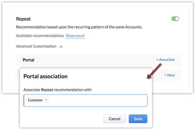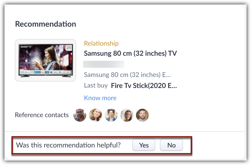 - Repetare - Acest tipar va identifica produsul sau serviciul care este selectat în mod repetat de cumpărător. De exemplu, un lanț de alimente și produse alimentare poate identifica clientul care achiziționează frecvent aceleași articole și le poate sugera pentru a preveni discontinuitatea în ciclul de achiziție. Utilizatorul poate apăsa pe ' Know more ' pentru a afla de ce recomandarea este fiabilă. Detalii precum când a fost achiziționat ultima dată articolul și tendința sunt afișate utilizatorului.