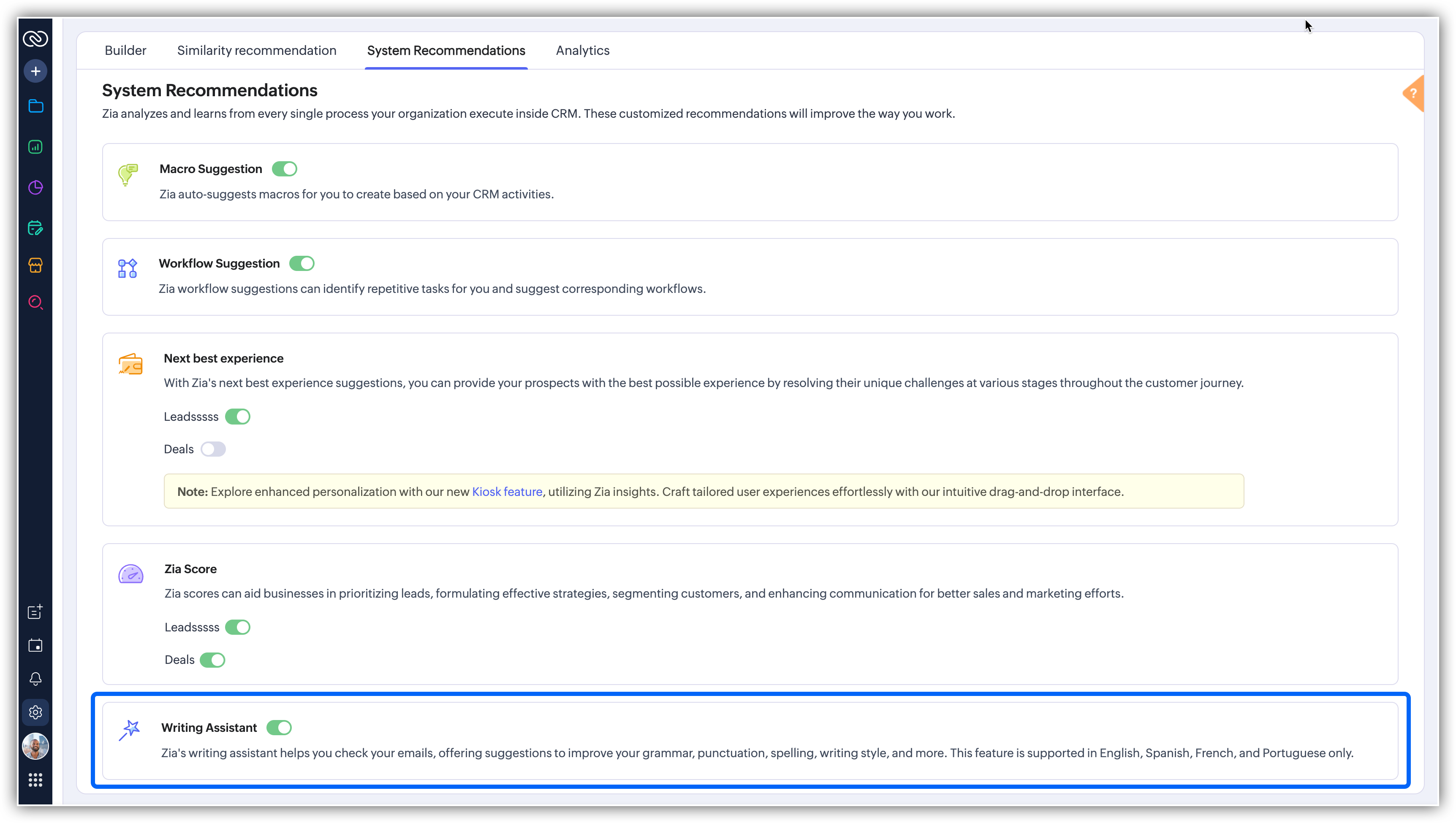 - Comută opțiunea Writing Assistant pentru a activa sau dezactiva funcționalitatea.