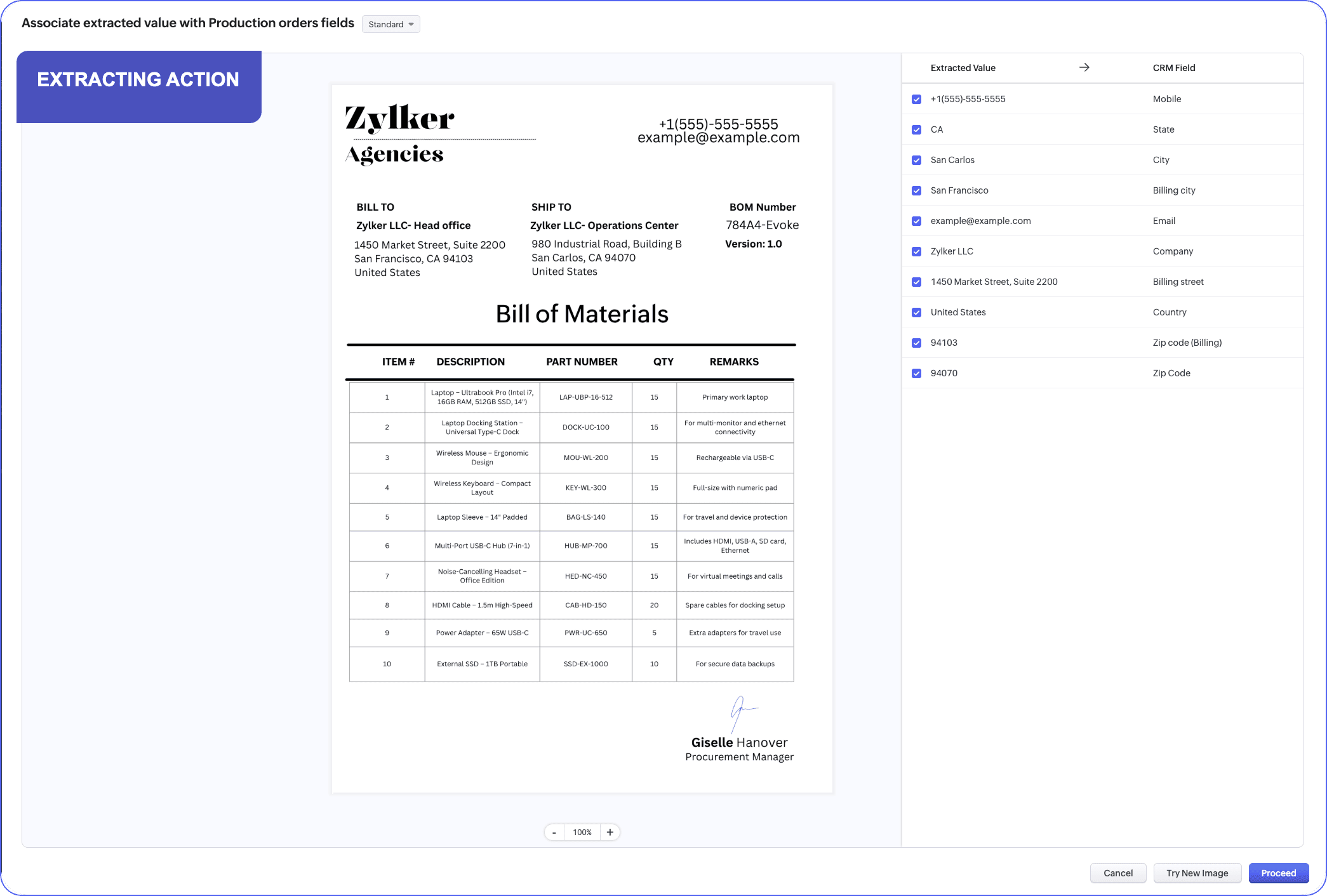 Deci, ori de câte ori este încărcată o imagine în modulul dat, pe baza câmpurilor alese, Zia poate identifica instantaneu valorile relevante din imaginea de intrare, le poate extrage ca date digitale și generează ieșiri asociind valorile corecte cu acele câmpuri CRM.