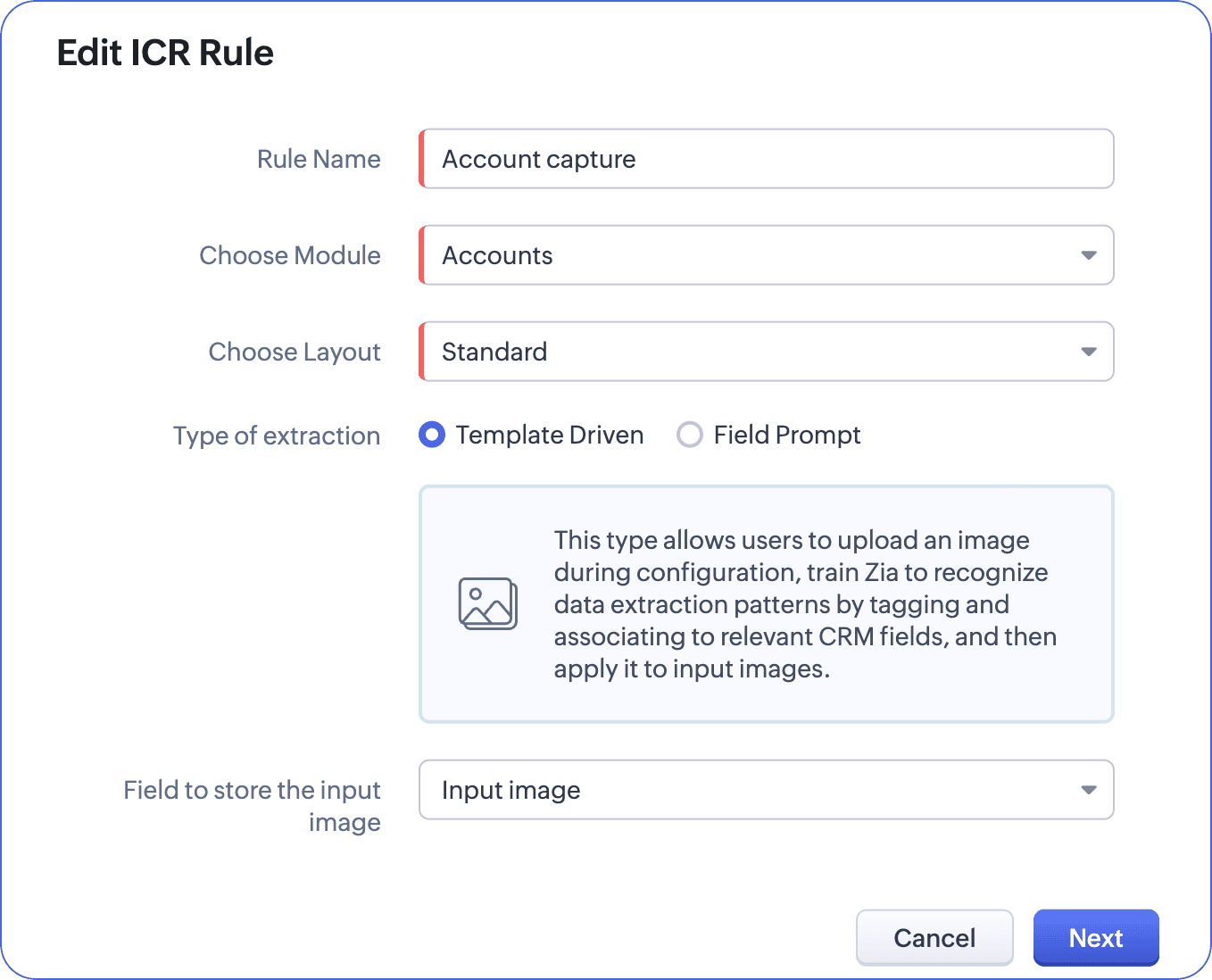 De la lucrul cu orientări standard predictive precum documentele de identitate la cele care diferă dinamic precum cărțile de vizită, afacerea ta lucrează cu o gamă de forme de date fizice și pentru a se potrivi și a acomoda diferite nevoi de afaceri, ICR în Zoho CRM este echipat cu două metode de extracție: