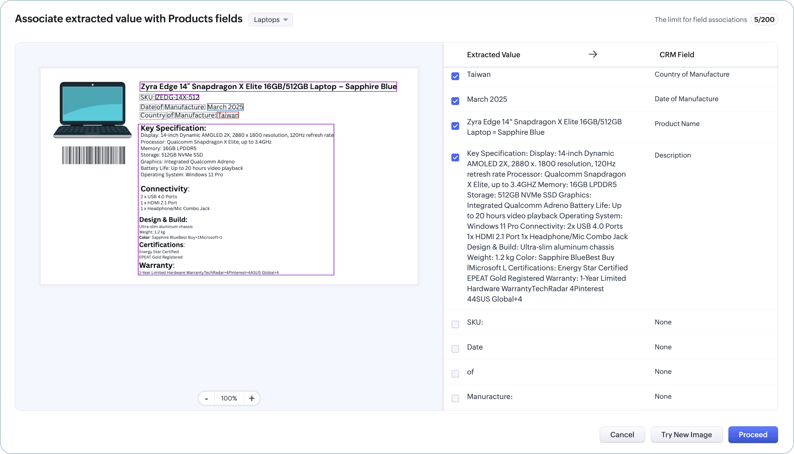 - Localizează manual valorile din imaginea încărcată și asociază-le cu câmpurile CRM din layout-ul/modulul ales.