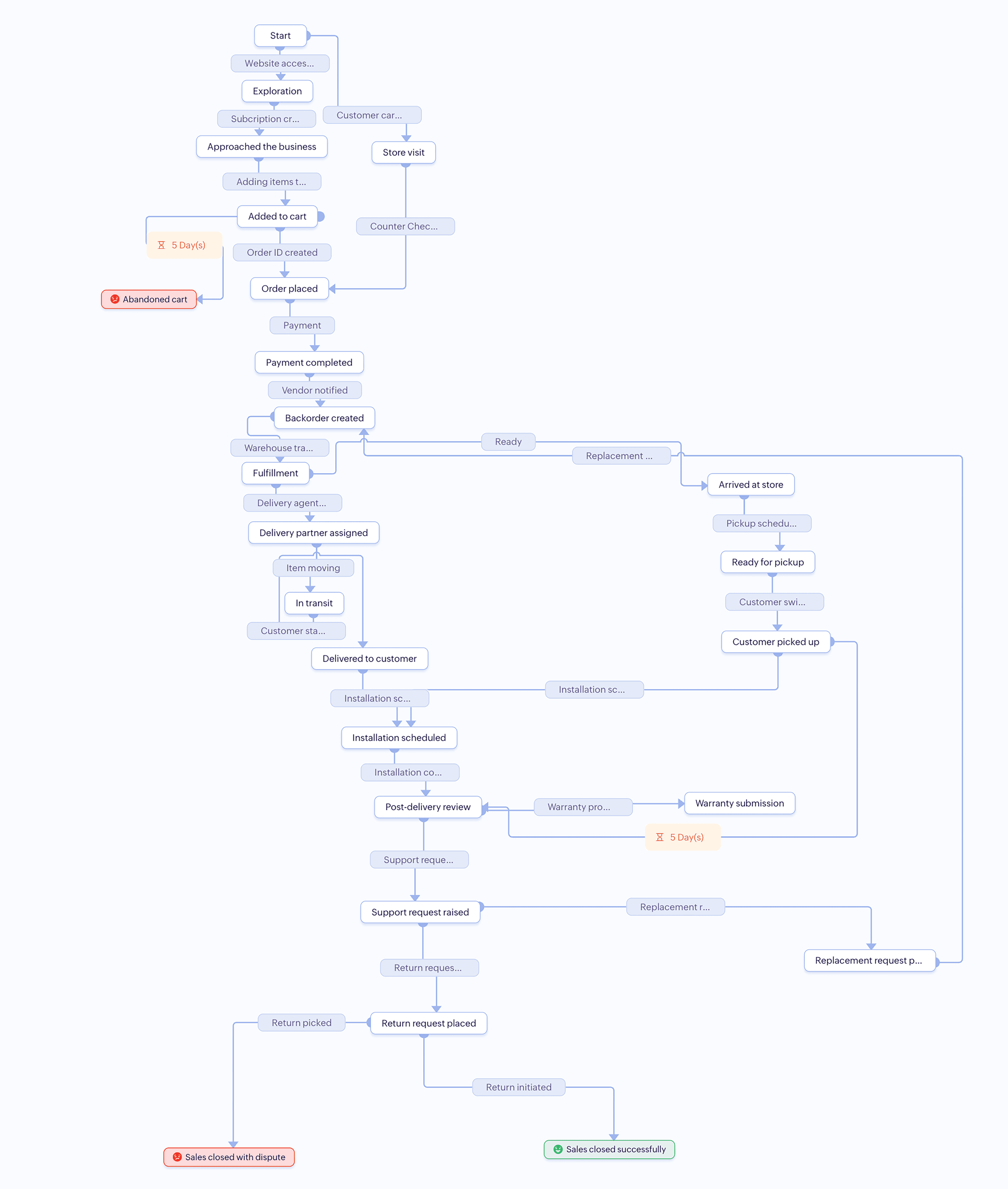 Te ajută să conectezi etapele de afaceri între ele, să modifici acțiunile contextuale pe baza evenimentelor interne și externe și să urmărești diferitele parcursuri care au loc în afacerea ta.