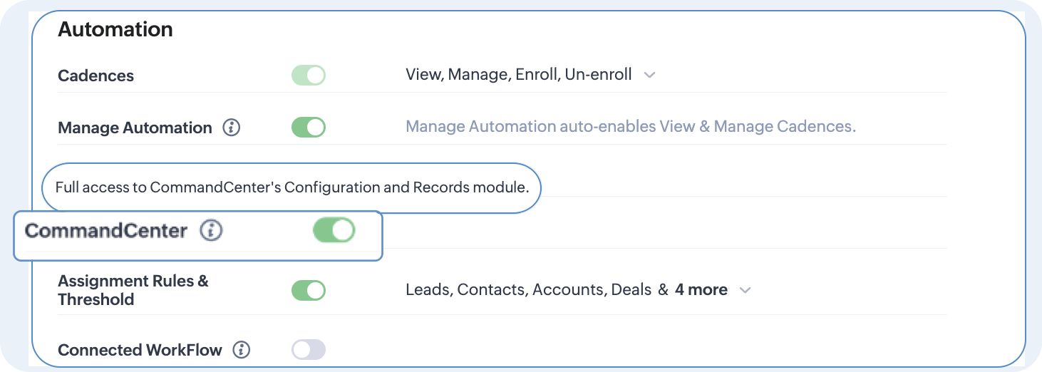 Permisiunea necesară pentru a accesa funcționalitatea: CommandCenter în secțiunea Automation