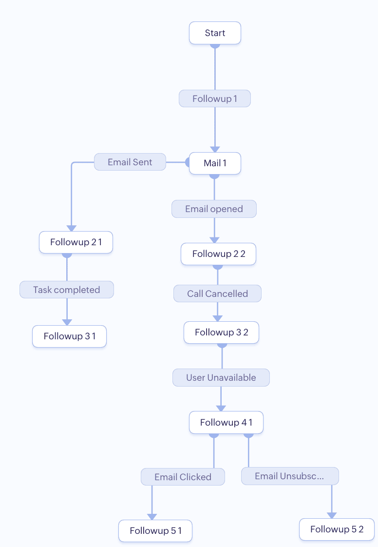 - Cadences te ajută să rulezi campanii drip bazate pe răspunsul și comportamentul pe care consumatorul tău le manifestă în faza de nurturare. Este singura automatizare din Zoho CRM care împărtășește tema CommandCenter: execuții secvențiale bazate pe evenimente, diferența constând în domeniul de aplicare — Cadences execută doar corespondențe, în timp ce CommandCenter îți permite să execuți tot felul de acțiuni.