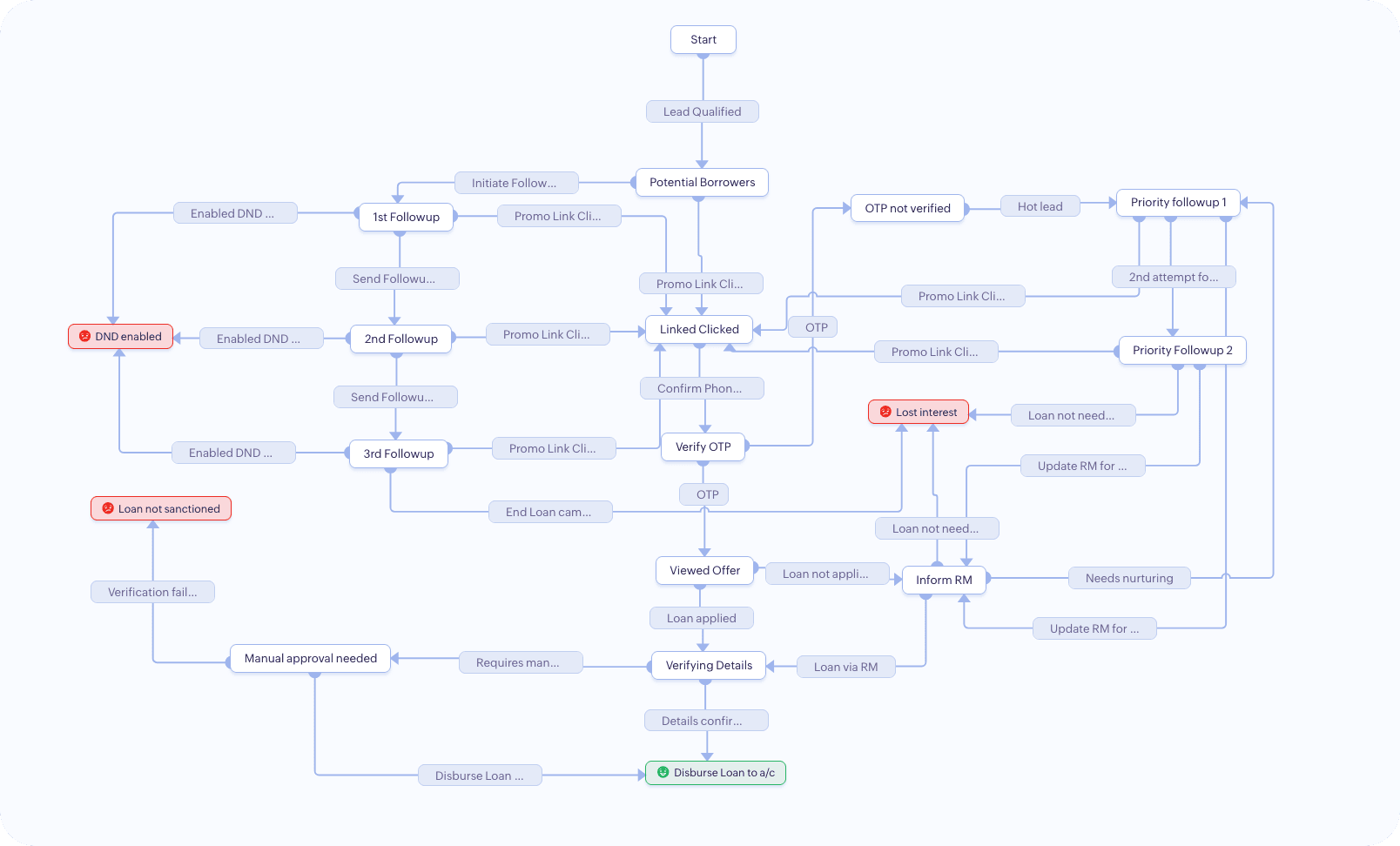 Acum, s-ar putea să îți imaginezi că acest lucru poate fi rezolvat cu o automatizare simplă bazată pe reguli. Totuși, definirea automatizărilor bazate pe reguli pentru fiecare etapă a afacerii tale nu este doar consumatoare de timp, ci și lipsită de context: ordinea de execuție nu este menținută, raportul succesului sau eșecului acțiunilor tale este fragmentat, iar atribuirea a ceea ce a cauzat conversia și ce a provocat abandonurile sunt informații pe care automatizările simple nu le pot evidenția.