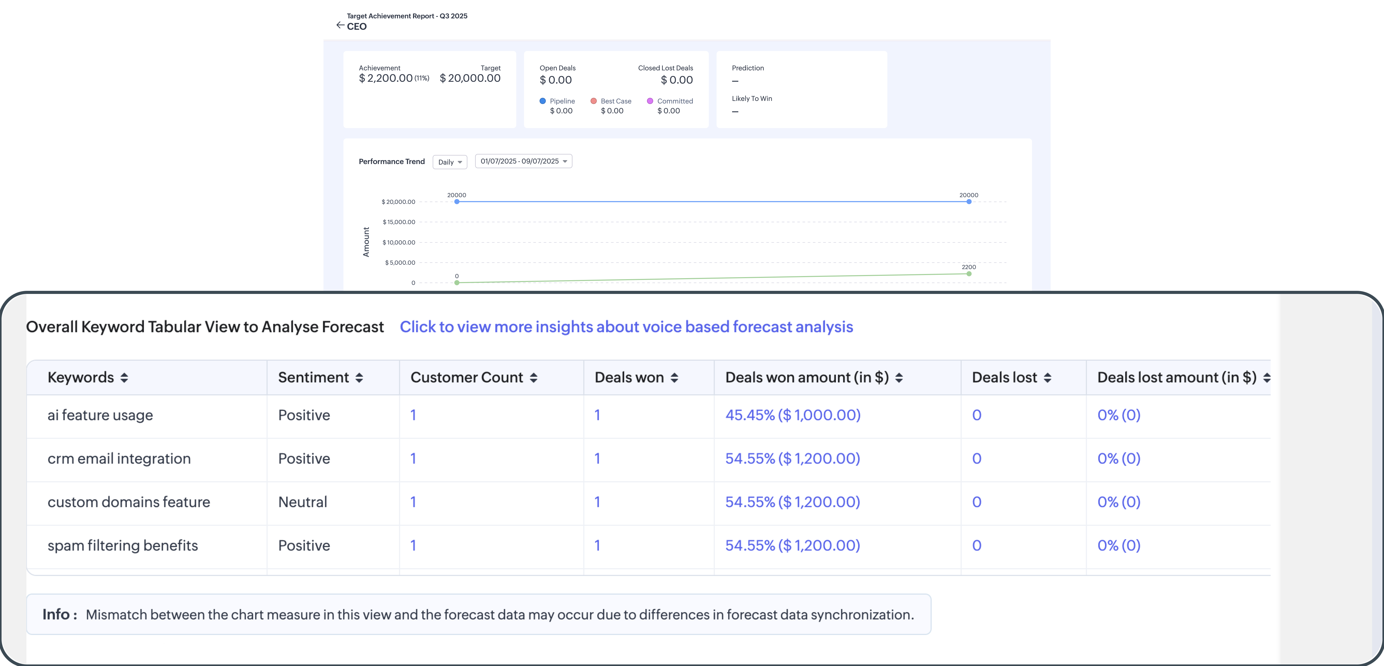 Această analiză acoperă detalii despre câte tranzacții au fost pierdute, câștigate sau deschise pentru perioada vizată. Tipul de cuvânt cheie menționat de clienți pentru acea lună sau trimestru înainte de pierderea sau câștigarea unei tranzacții sau pentru orice tranzacție deschisă. Poți vizualiza cele mai recente cuvinte cheie rostite înainte de fiecare etapă a unui ciclu de vânzări.