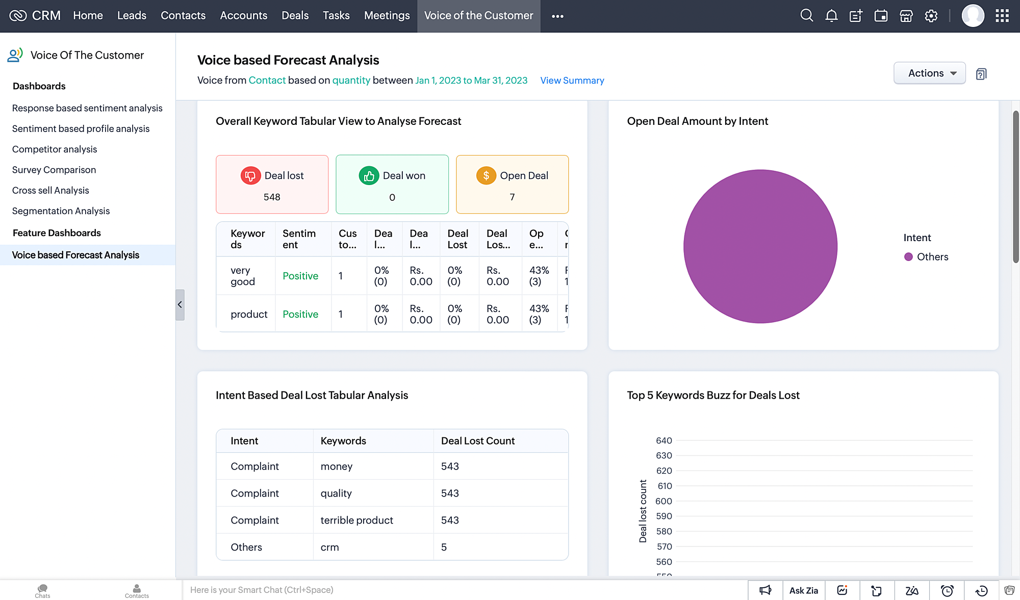 Analiza prognozelor în VoC implică o analiză detaliată a tendințelor sau evenimentelor de vânzări din trecut și prezent care prezic evenimente viitoare. Pe baza acestei tehnici, Zoho CRM a elaborat o analiză bazată pe inteligență asupra cuvintelor cheie primite de la clienți prin diverse canale. Zia captează informații despre cele mai importante și mai recente cuvinte cheie menționate de clienți și despre intenția cu care au fost rostite cuvintele cheie. Aceste informații, coroborate cu multe alte funcții CRM, vor oferi tablouri de bord perspicace pentru clienți.