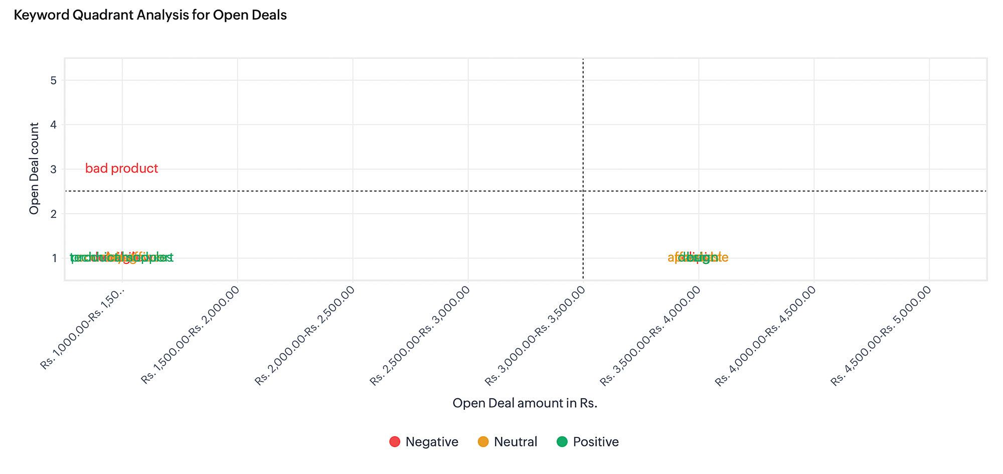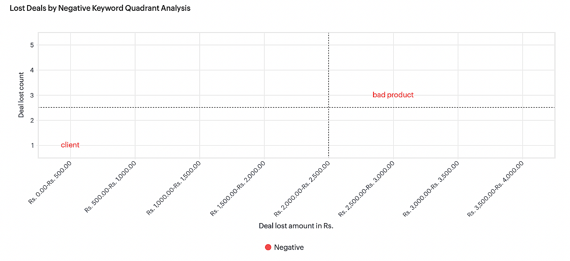 Cele mai recente cuvinte cheie menționate înainte de tranzacțiile pierdute sunt reprezentate în raport cu quadrantele. Acest lucru ajută utilizatorul să evite folosirea acelor cuvinte cheie pentru tranzacțiile viitoare și să prioritizeze problemele pentru a evita mai multe pierderi de tranzacții. Acest lucru ajută la atingerea țintei stabilite pentru o perioadă prin analizarea lacunei și evitarea acelor cuvinte cheie care duc la pierderea tranzacției.