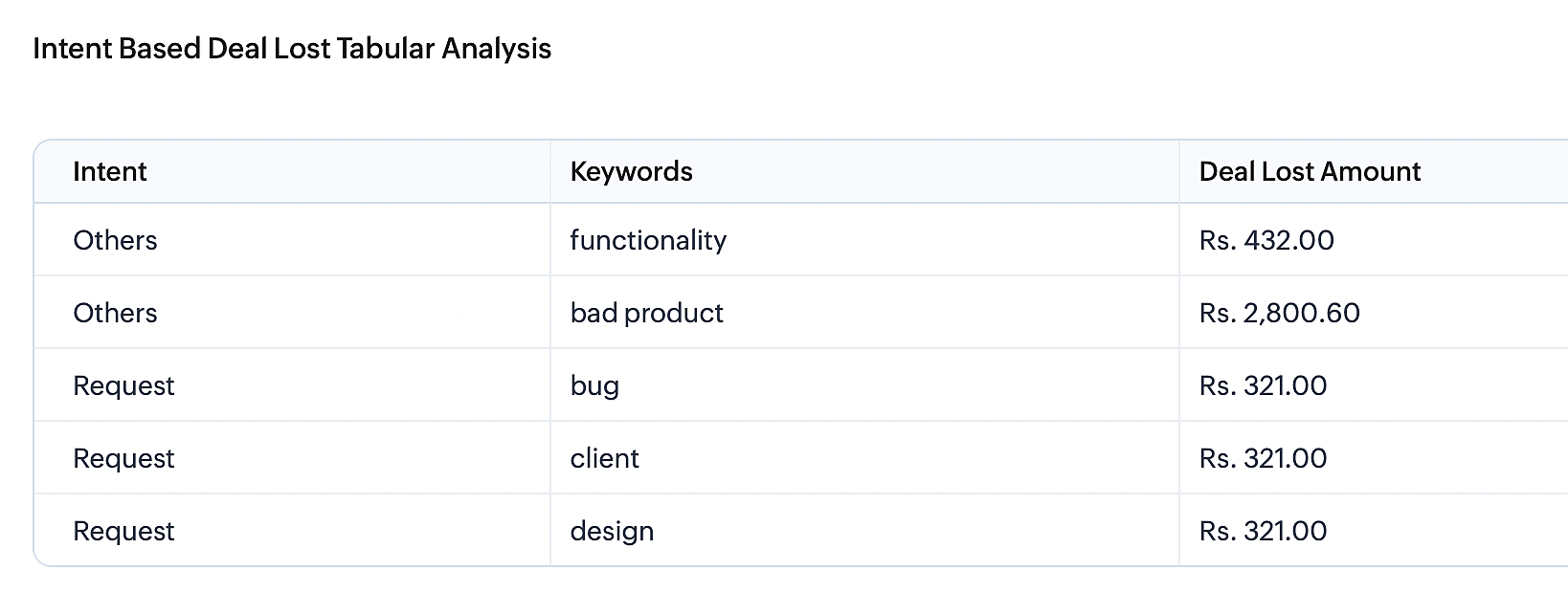 Afișează procentul de pierdere a tranzacțiilor pentru fiecare lună sau trimestru. Numărul de tranzacții pierdute în care cele mai importante cuvinte cheie au fost rostite în perioada aleasă. Acest lucru va ajuta la înțelegerea cuvintelor cheie care au dus la pierderea tranzacției și la neatingerea țintei.