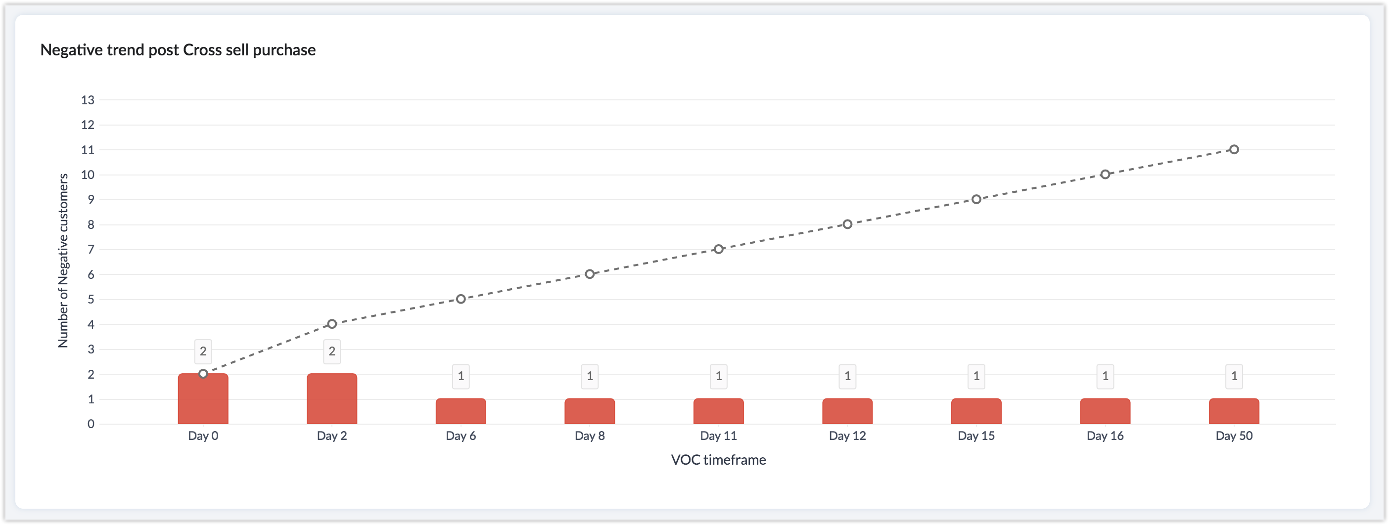 Similar cu tendința pozitivă, acest grafic bară-linie îți oferă informații rapide despre tendința negativă după achizițiile prin cross-sell. Îți prezintă o progresie cumulativă a numărului de clienți care exprimă un sentiment negativ într-un anumit interval de timp. De exemplu, din graficul de mai jos, poți observa o tendință generală ascendentă — în ziua 2, a început cu doi clienți, iar în ziua 50, ai 11 clienți. Pe lângă urmărirea acestei tendințe, poți vedea exact în ziua a 16-a câți clienți au făcut o mențiune negativă — 1. În timp ce graficul cu bare îți oferă totalul zilnic de clienți, graficul liniar indică tendința pe întregul interval de timp.