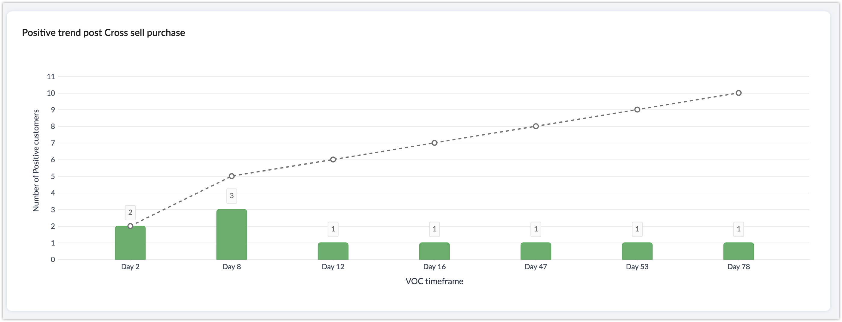 Acest grafic bară-linie îți oferă informații rapide despre tendința pozitivă după achizițiile prin cross-sell. Îți prezintă o progresie cumulativă a numărului de clienți care exprimă un sentiment pozitiv într-un anumit interval de timp. De exemplu, din graficul de mai jos, poți observa o tendință generală ascendentă — în ziua 2, a început cu doi clienți, iar în ziua 78, ai 10 clienți. Pe lângă urmărirea acestei tendințe, poți vedea exact în ziua a 53-a câți clienți au făcut o mențiune pozitivă — 1. În timp ce graficul cu bare îți oferă totalul zilnic de clienți, graficul liniar indică tendința pe întregul interval de timp.