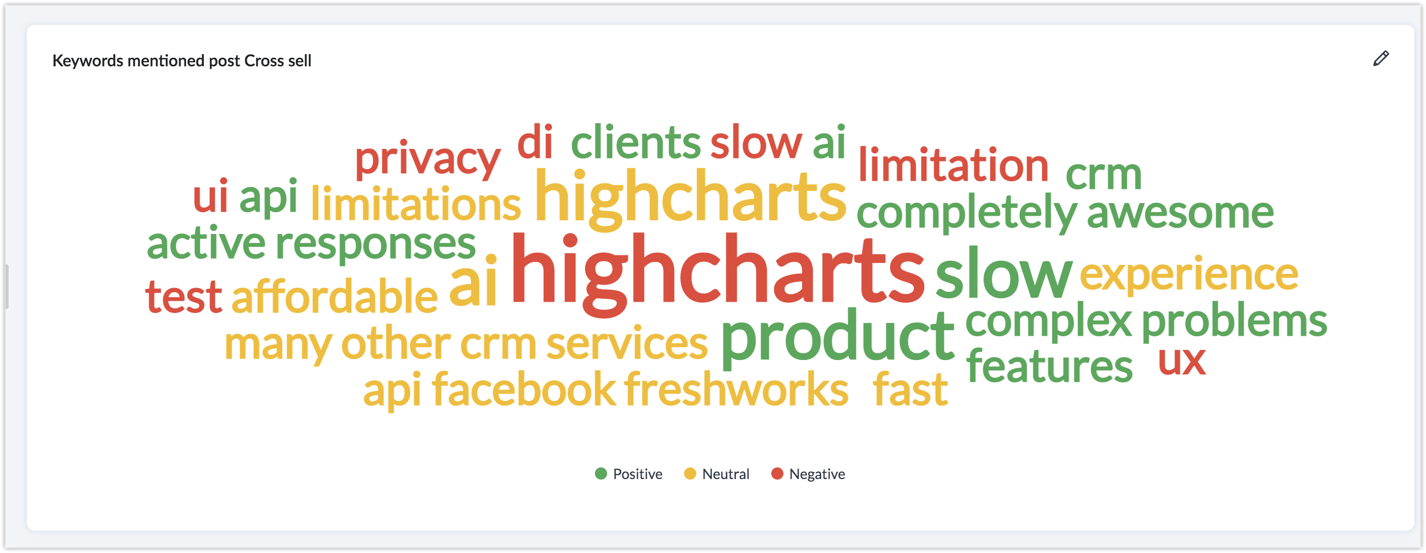 Dashboardul „Cuvinte cheie menționate după cross-sell" este conceput pentru a-ți oferi o imagine generală rapidă a subiectelor în legătură cu care clienții tăi exprimă o reacție pozitivă, negativă sau neutră. Din acest dashboard poți fi în măsură să identifici rapid ce a mers bine sau ce a mers prost, astfel încât să poți lua imediat măsurile relevante.