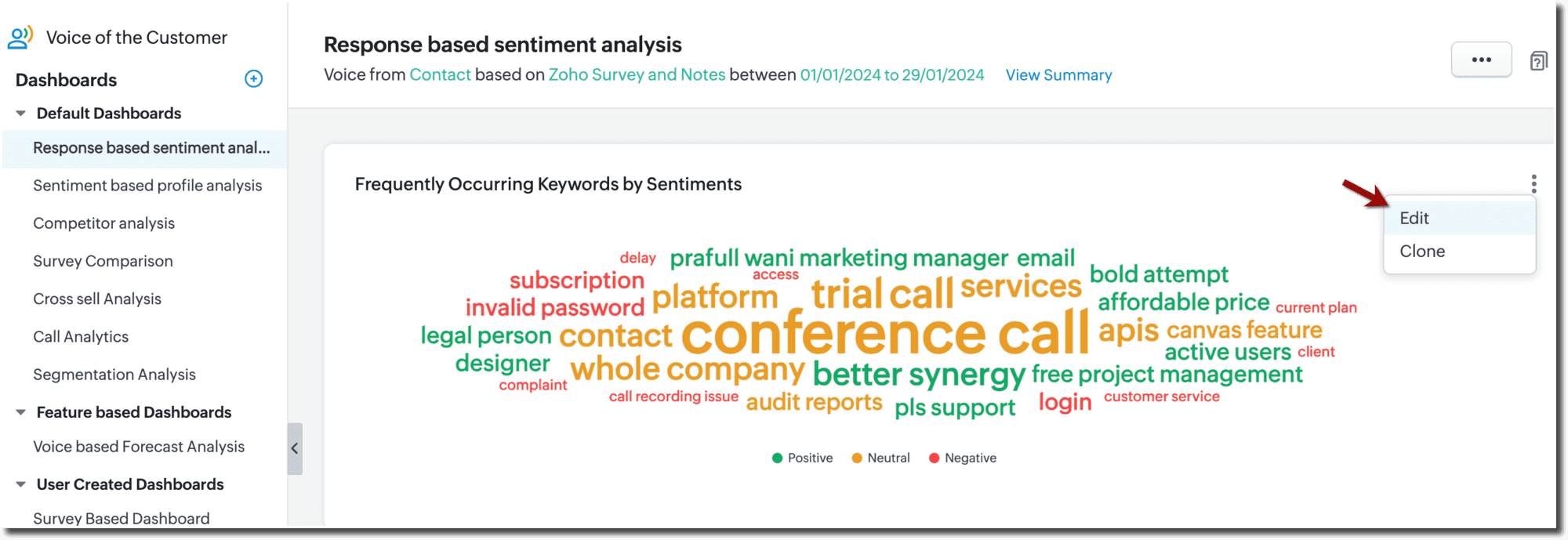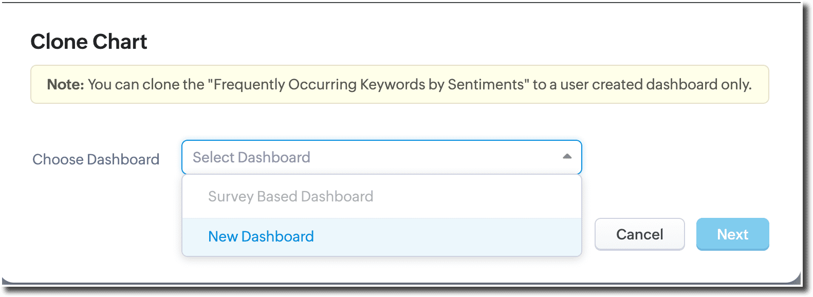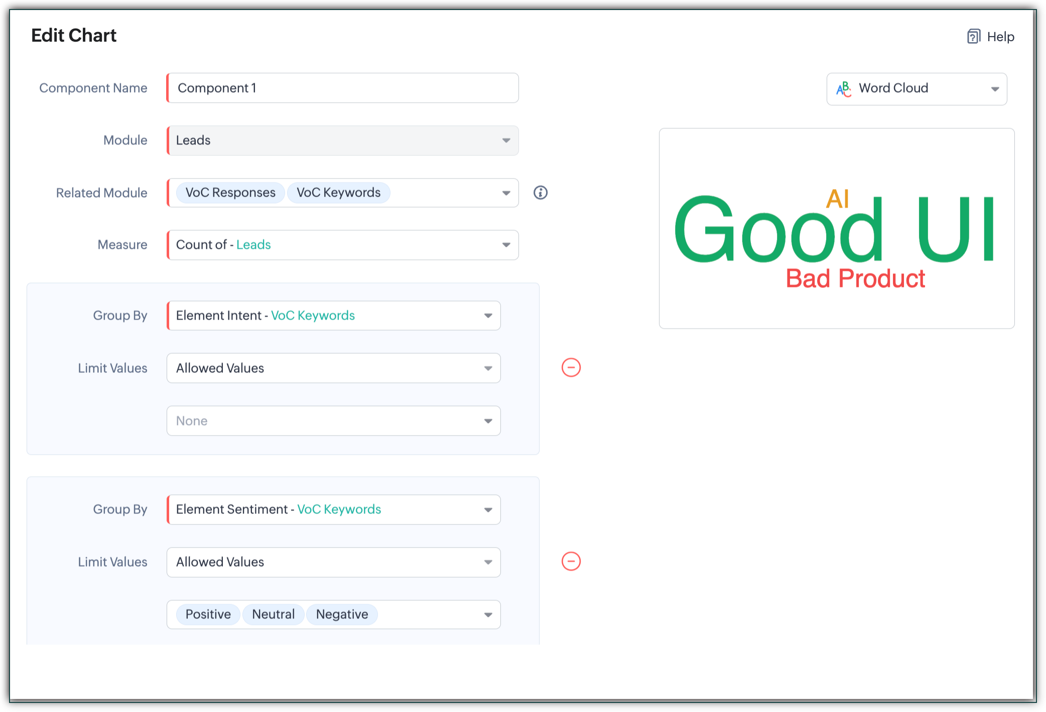 Toate componentele din dashboardurile personalizate sunt editabile, iar unele dintre componentele din dashboardul implicit pot fi editate. De exemplu, să presupunem că există un grafic de tip coloană care arată primele 5 cuvinte cheie. Poți edita acest grafic pentru informații mai detaliate, unde poate arăta primele 5 cuvinte cheie grupate după sentiment, cu valorile permise fiind 'negativ', și poți grupa suplimentar după 'competitori'.