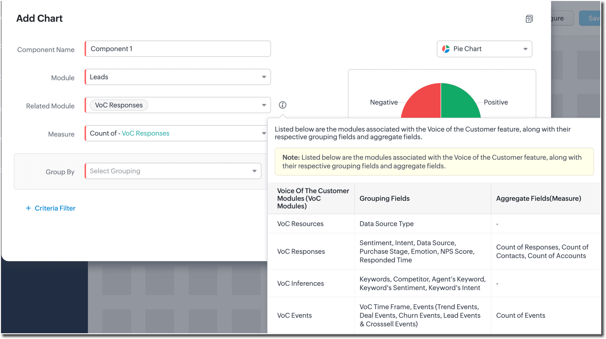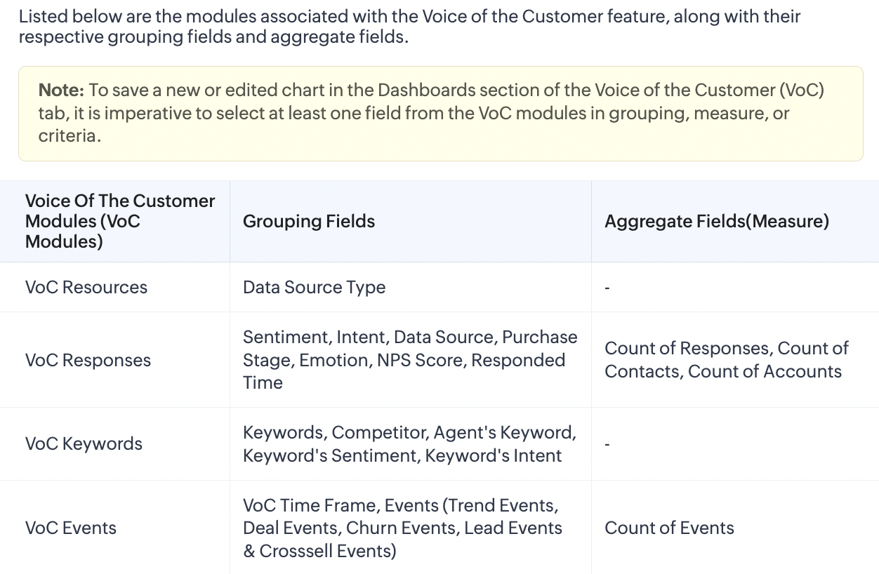 Informațiile VoC sunt stocate în module precum VoC Responses, VoC Keywords, VoC Resources și VoC Events. Utilizatorii nu pot vizualiza direct înregistrările sau datele din aceste module, dar informațiile stocate aici pot fi folosite pentru a crea grafice în dashboarduri.