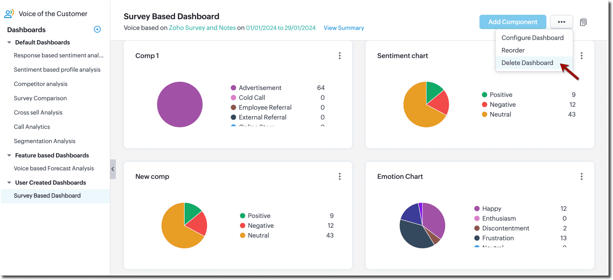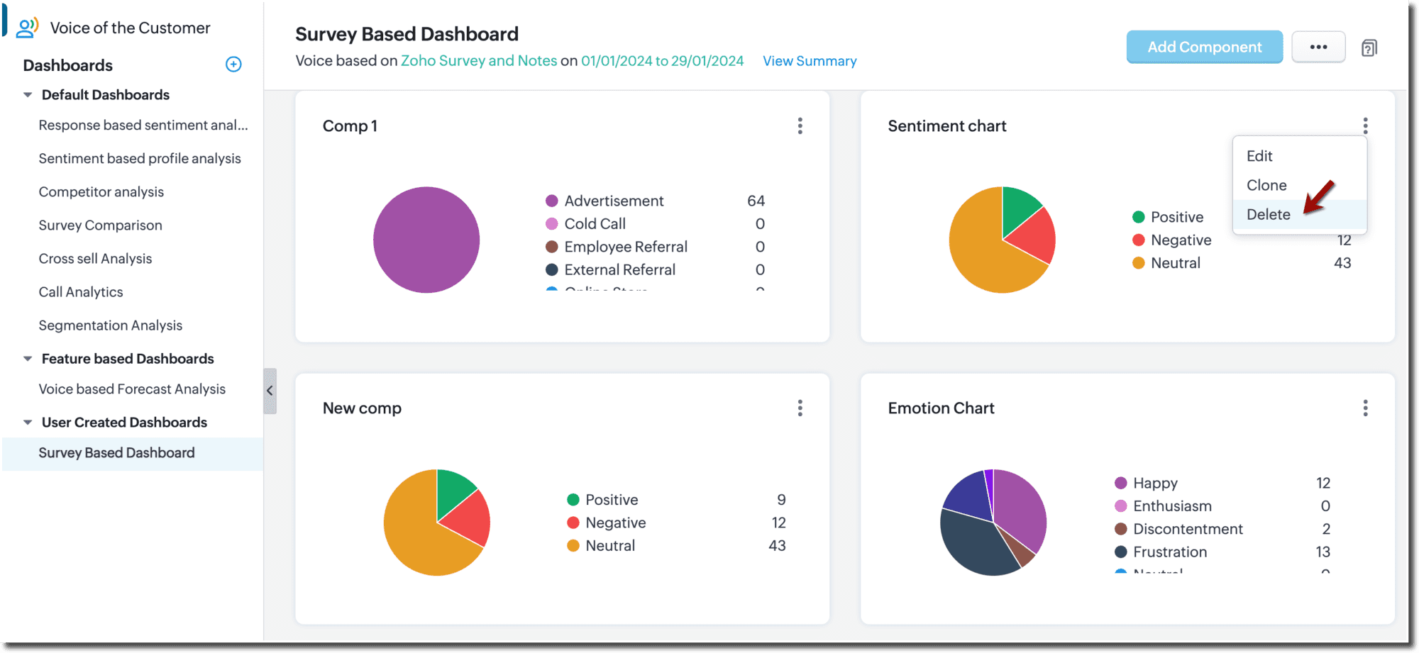 Componentele nu pot fi șterse din dashboardurile implicite și de funcționalitate. Cu toate acestea, poți șterge componente din dashboardurile personalizate.