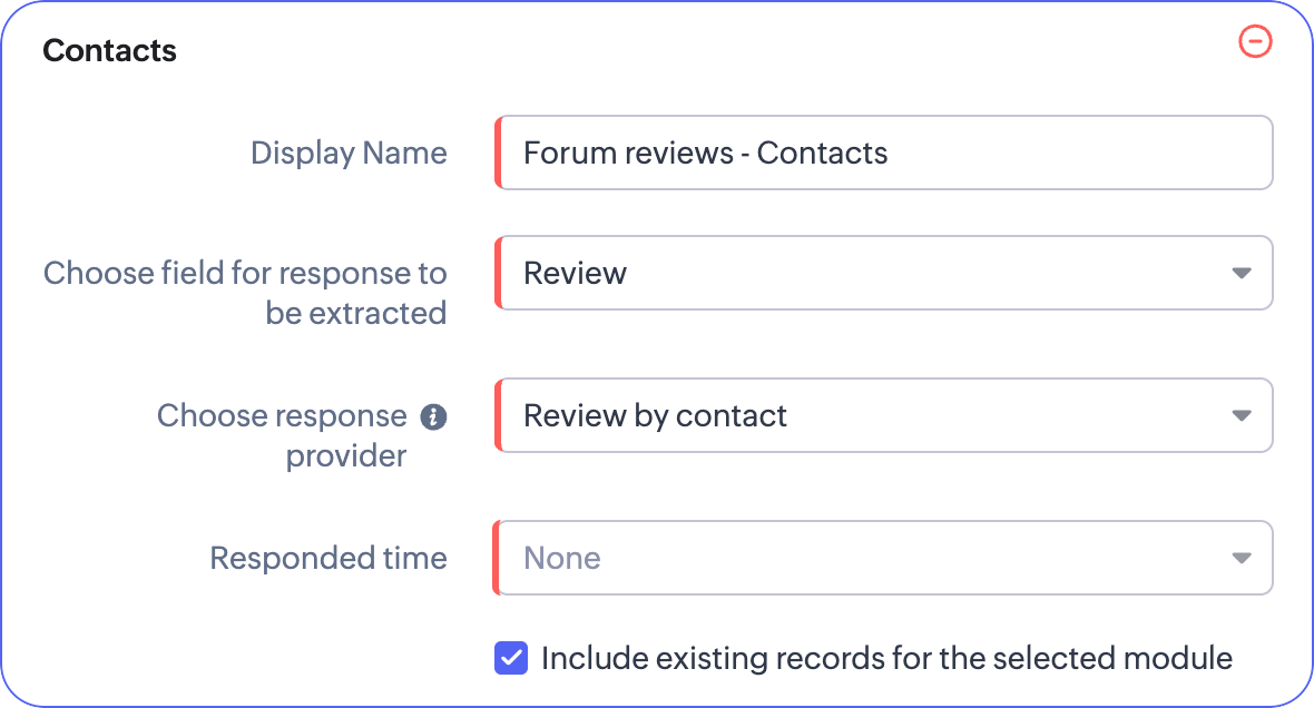 Fie că este vorba de module principale sau asociate (atât module implicite cât și personalizate), există câteva câmpuri de intrare pe baza cărora sunt colectate informațiile VoC. De exemplu, în cazul graficului de cohortă al tranzacțiilor pierdute pe industrii în raport cu concurenții văzut mai sus, modulul principal este Contacts și modulul asociat este Deals. Câmpurile implicate sunt: