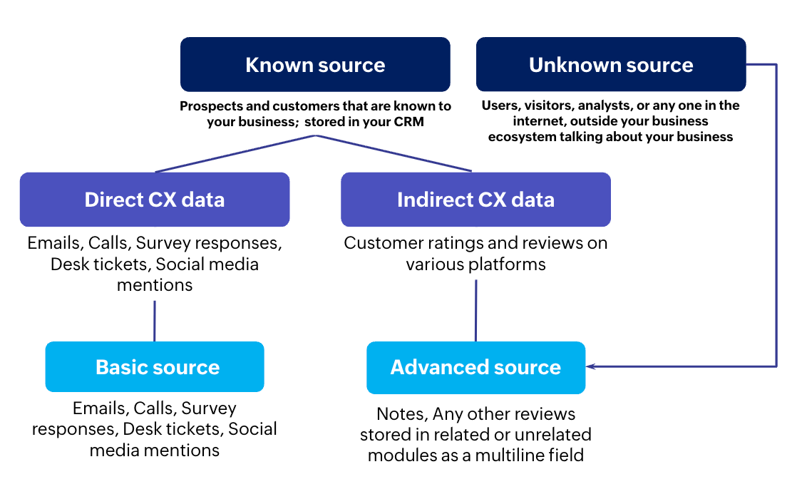Există două tipuri de date pe care le poți aduce: date CX directe și indirecte din două surse: surse cunoscute și surse necunoscute. Pentru ușurința configurării, aceste surse de date sunt clasificate suplimentar ca surse de bază și avansate.