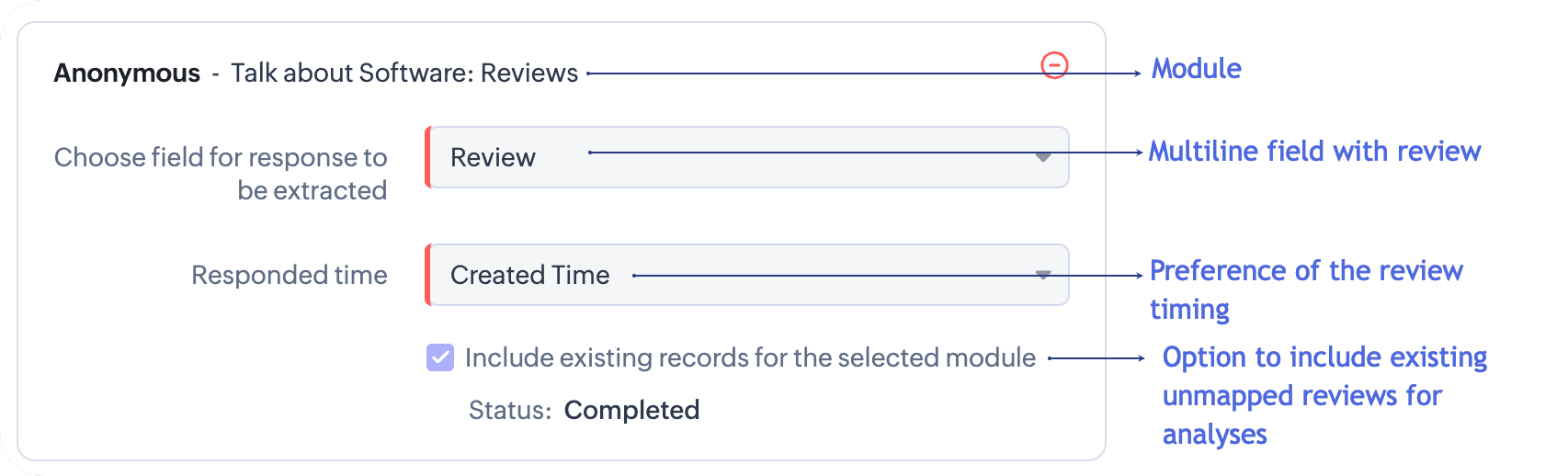 Poți personaliza setările VoC astfel încât să oferi instrucțiuni personalizate CRM-ului cu privire la modulul din care să preia datele și câmpurile din module pe care să le monitorizeze pentru a obține informațiile necesare.