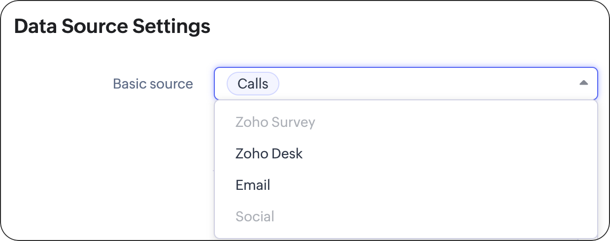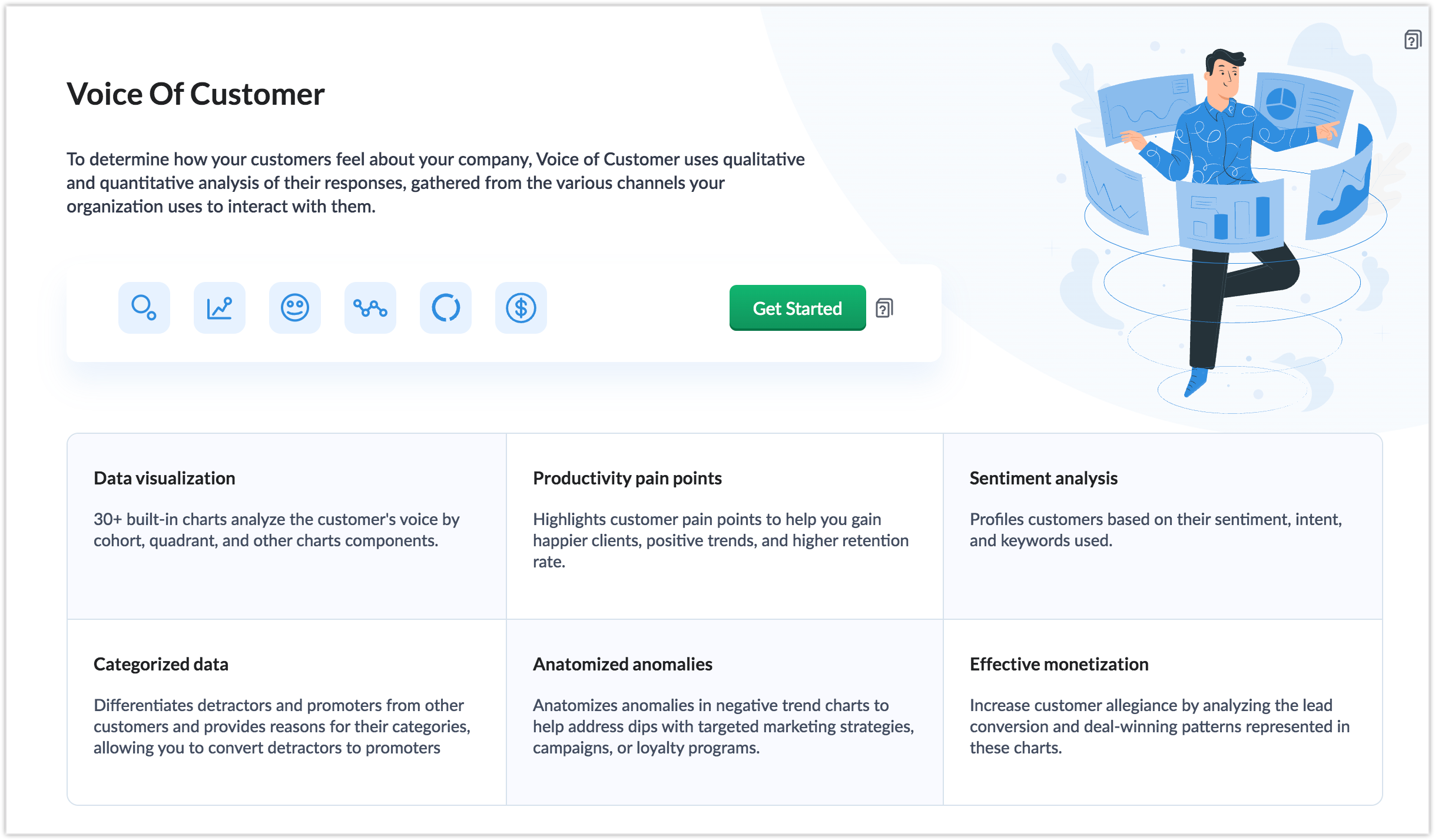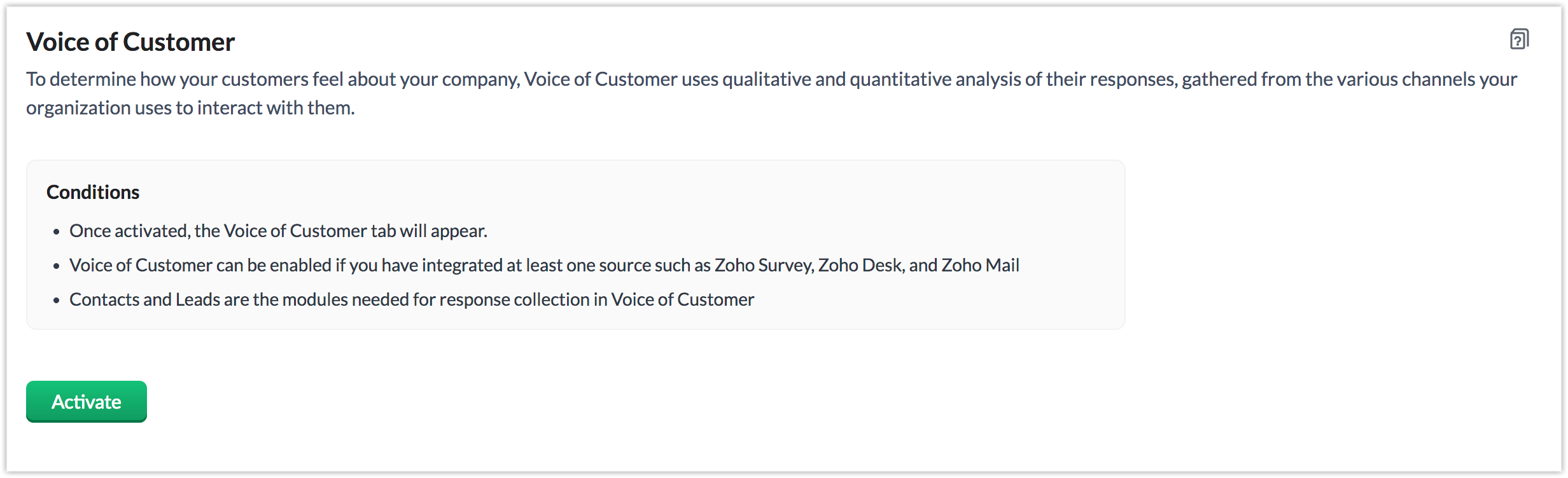 VoC este disponibil pentru activare chiar dacă ai integrat unul dintre canale: Email, Apeluri, Zoho Survey, Social și Zoho Desk cu organizația ta. Totuși, pentru a vizualiza toate dashboard-urile cu diverse informații, ai nevoie ca toate cele patru canale să fie conectate.