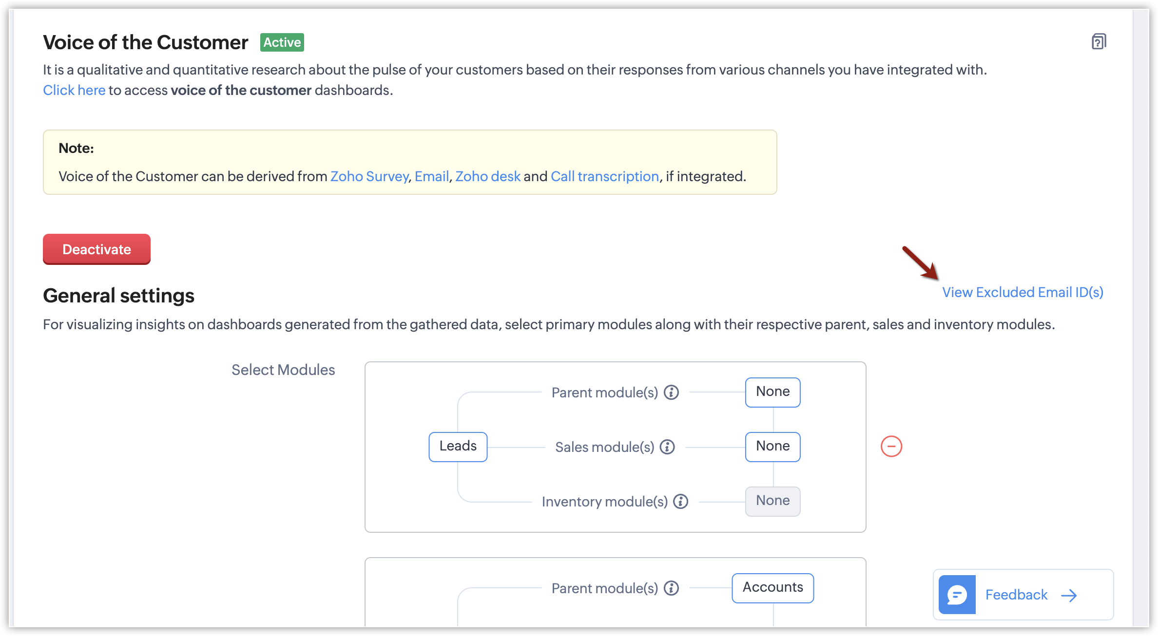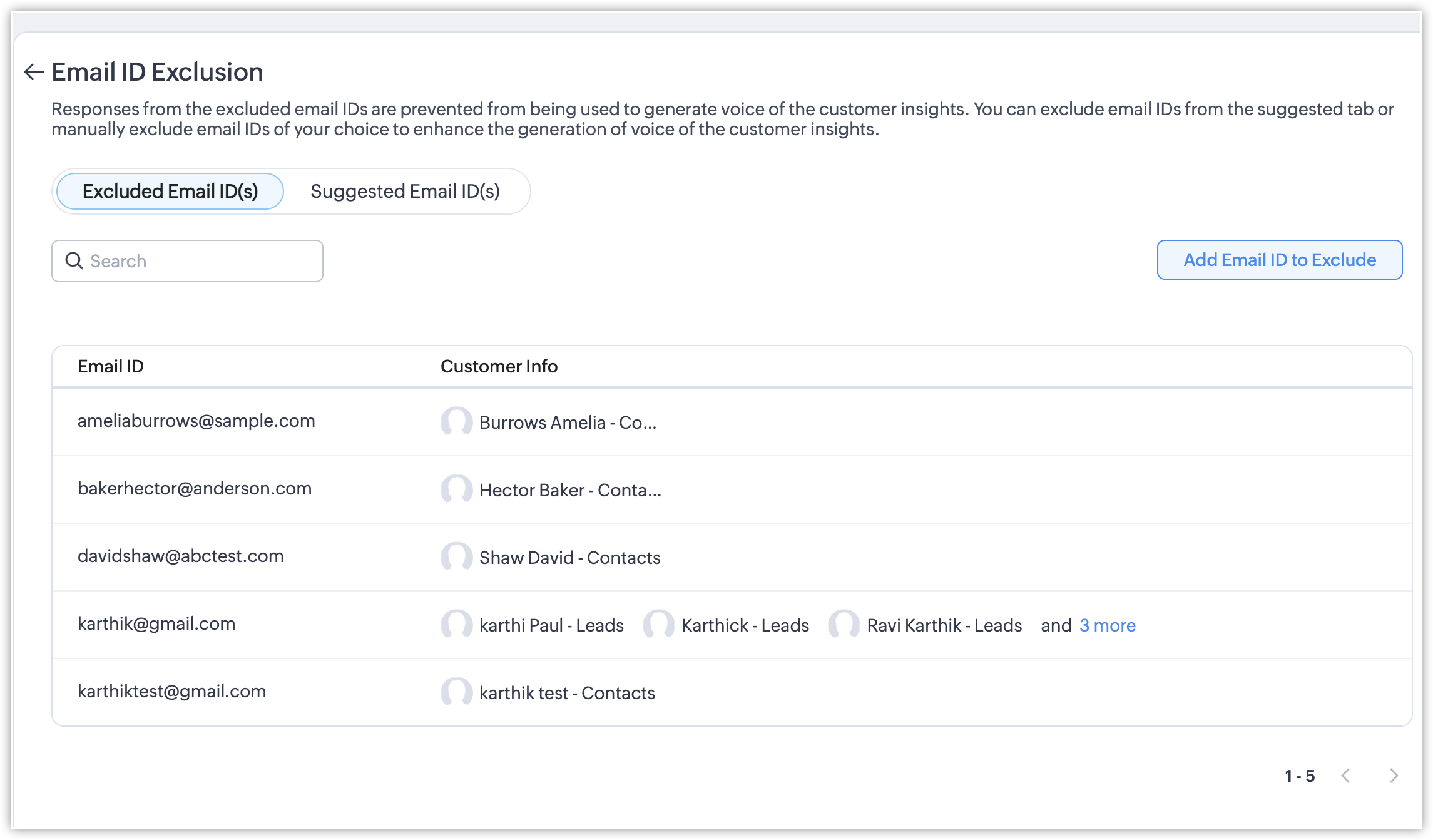 - Excluded Email ID(s): Acestea sunt ID-urile de e-mail care au fost excluse din analiza VoC. Toate ID-urile de e-mail excluse vor fi listate aici împreună cu detaliile clientului asociat.