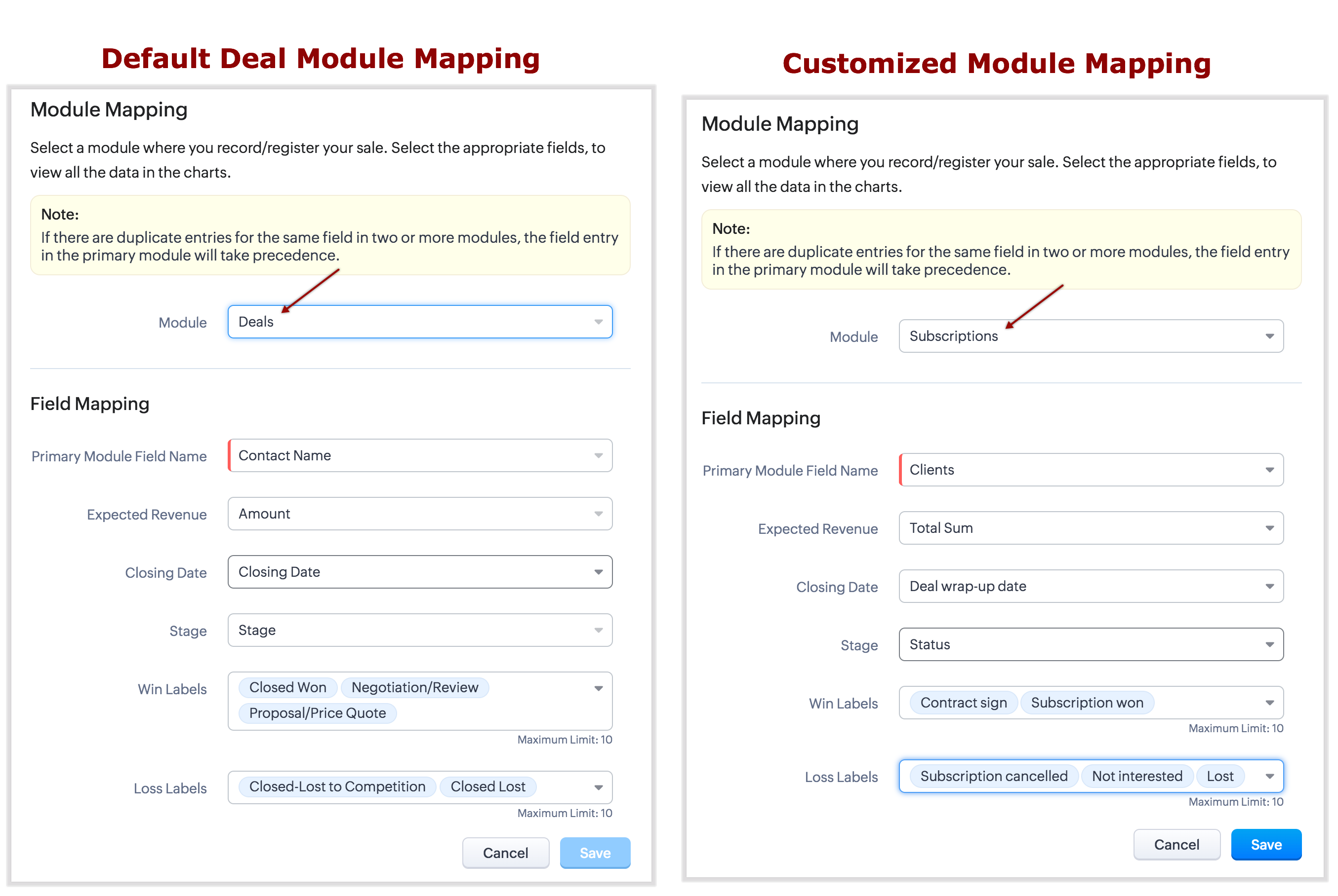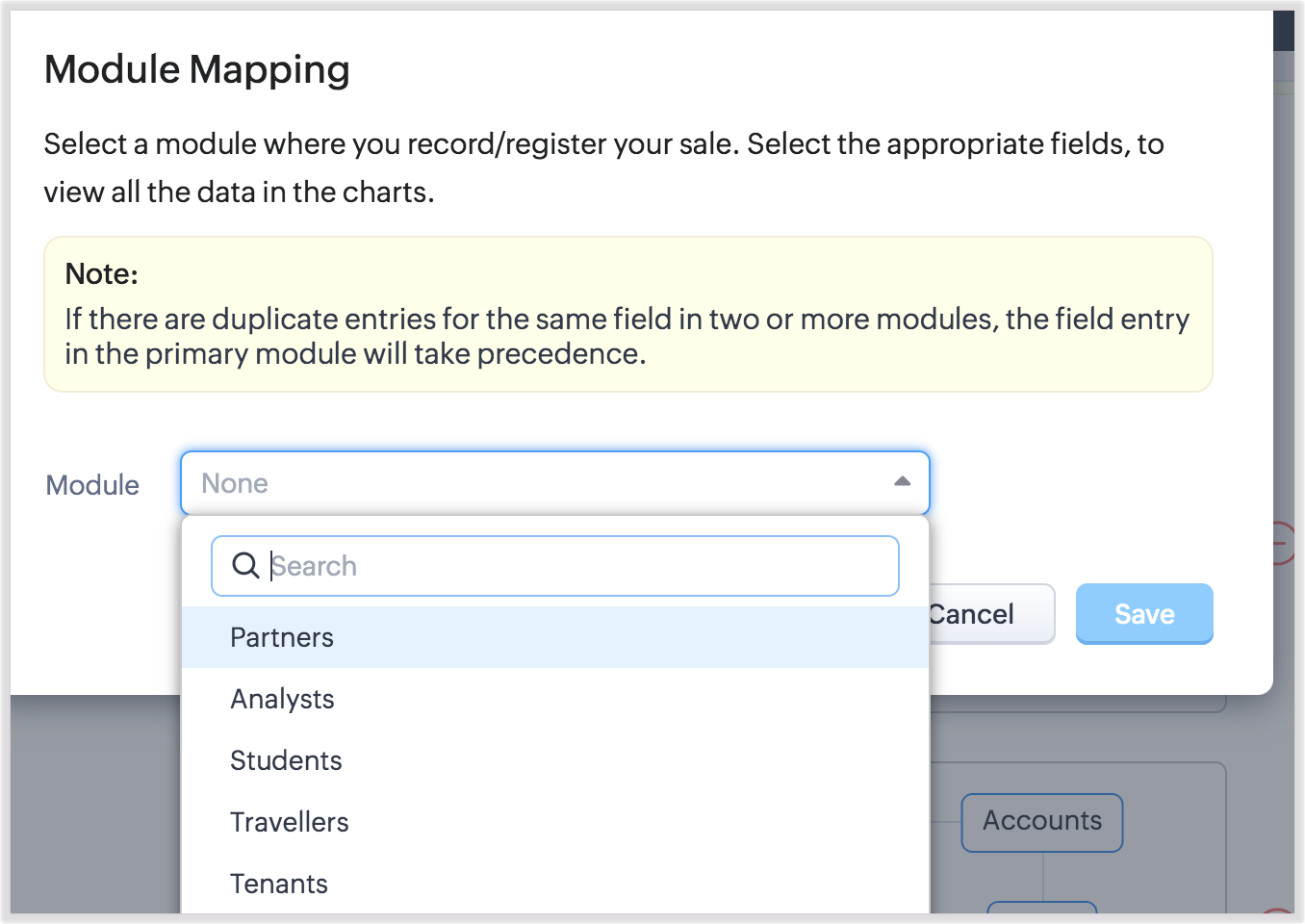 - Modul de vânzări: Aici vei alege de obicei modulul în care sunt urmărite datele tale de vânzări. Exemplu: Deals/Opportunities/Subscriptions/Potentials.