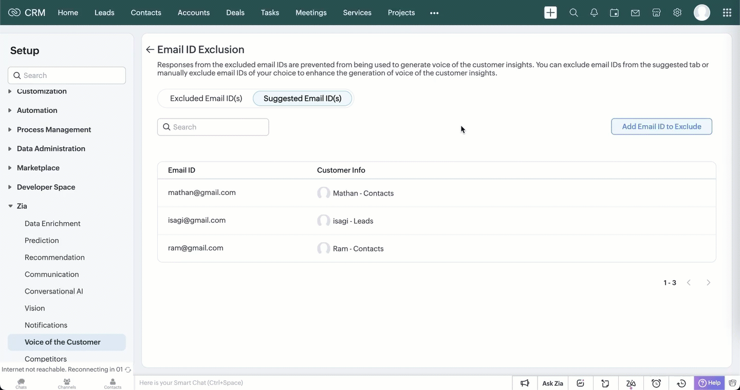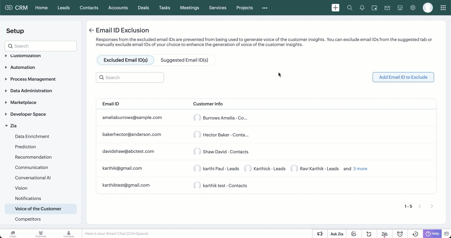 - Pentru a exclude ID-uri de e-mail personalizate, caută ID-ul de e-mail. Poți vedea înregistrarea clientului asociat și confirma excluderea. Odată exclus, VoC nu va mai analiza comunicările de la acel ID de e-mail.