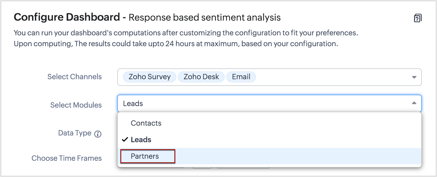 Implicit, dashboard-urile VoC sunt aplicabile pentru Leads și Contacts. Acestea fiind spuse, poți alege să ai informații VoC configurate și pentru module suplimentare, inclusiv module personalizate. Poți, de asemenea, să elimini Leads și Contacts dacă nu le folosești și să mapezi modulele principale aplicabile din care vor fi preluate dashboard-urile VoC.