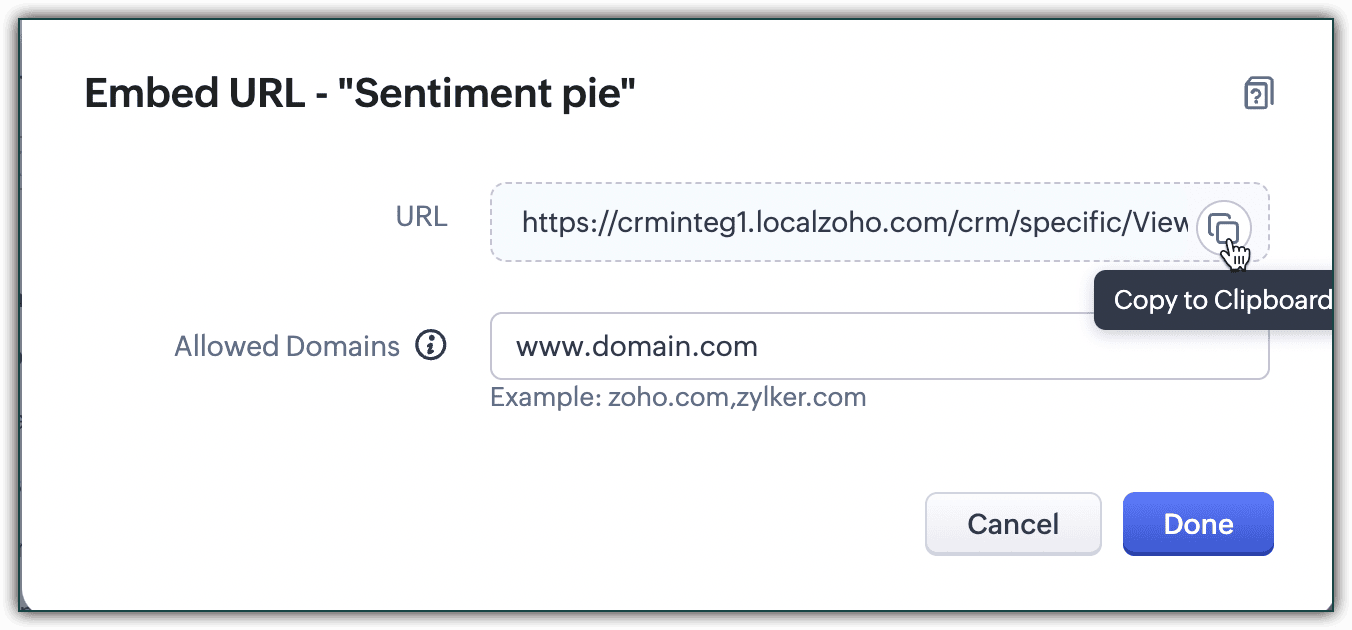 Embed URL îți oferă un URL pentru a găzdui graficul pe un site web. De asemenea, pentru a valida securitatea domeniului, poți menționa domeniile permise și să afișezi graficul fără probleme.
