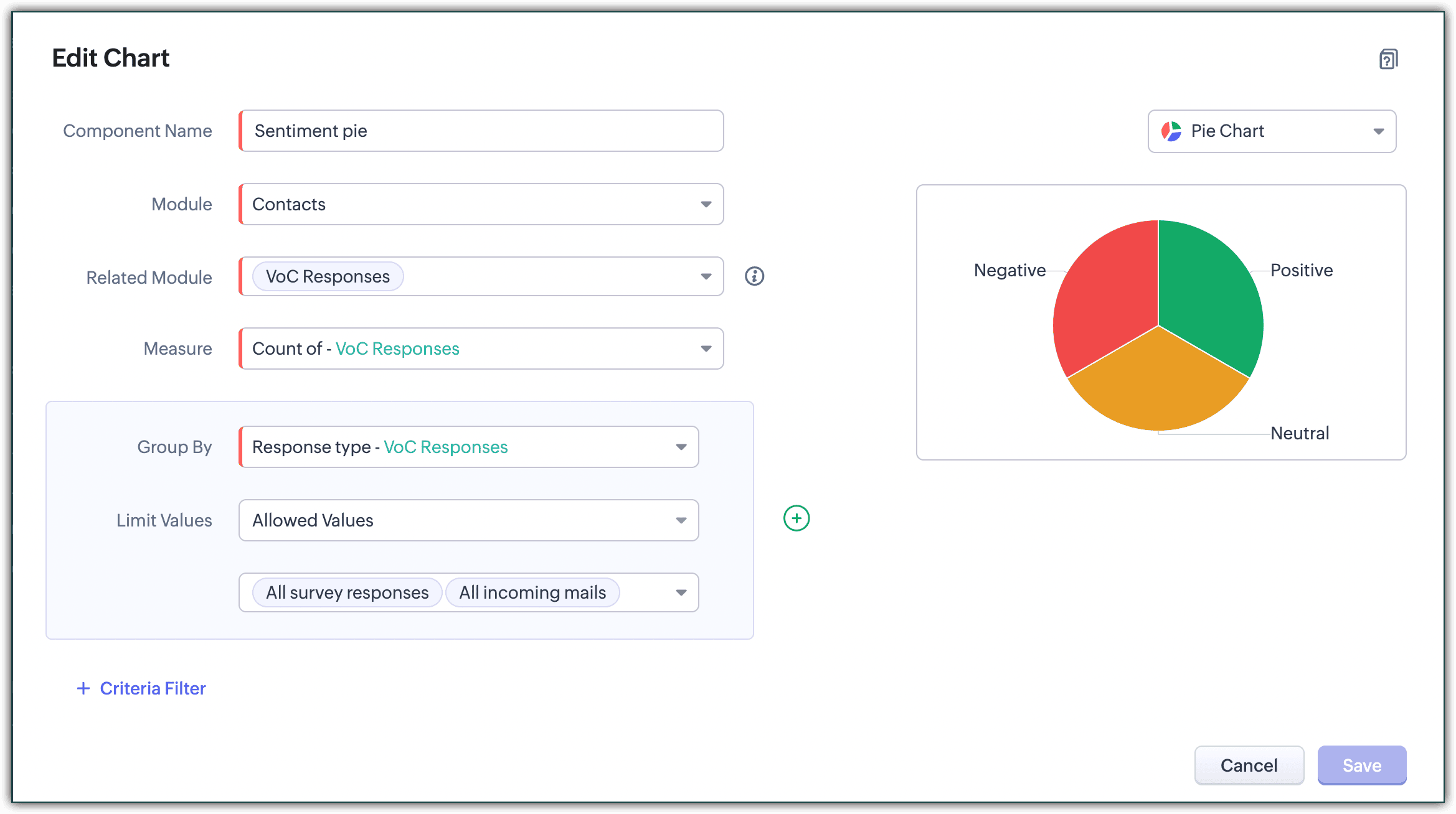 - Apasă Add Criteria și alege câmpul și valoarea pentru a crea VOC pentru un subset specific de lead-uri sau contacte.