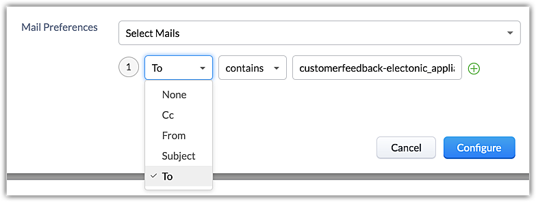 Preferințe e-mail: Setează preferințe dacă dorești ca Zia să analizeze doar e-mailuri specifice. De exemplu, e-mailuri trimise pentru un anumit produs (de ex., customerfeedback-electonic_appliances@zylkersales.com).