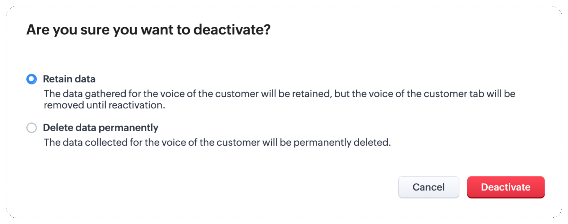 Notă: Este important de reținut că dacă alegi să dezactivezi cu datele intacte, doar datele din perioada intermediară nu vor fi disponibile. Pe de altă parte, dacă ștergi toate datele existente, reactivarea VoC va începe de la zero.Articole Similare