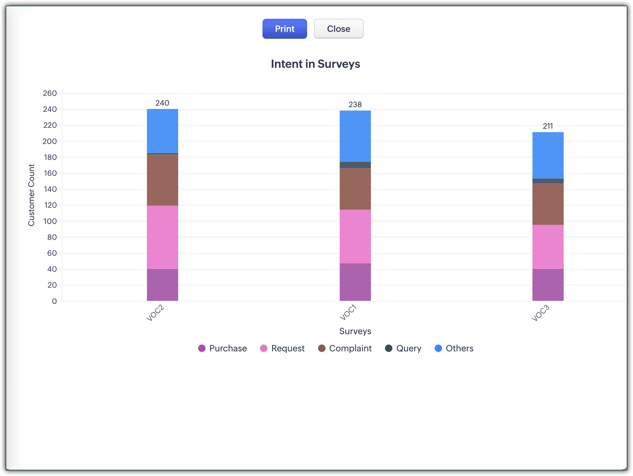 - Opțiunile: print, embed URL, download și share nu sunt disponibile pentru graficele parte din informații personale despre clienți, grafice multi-wordcloud din comparația sondajelor și anomalia tendinței concurenților din dashboard-ul concurenților.