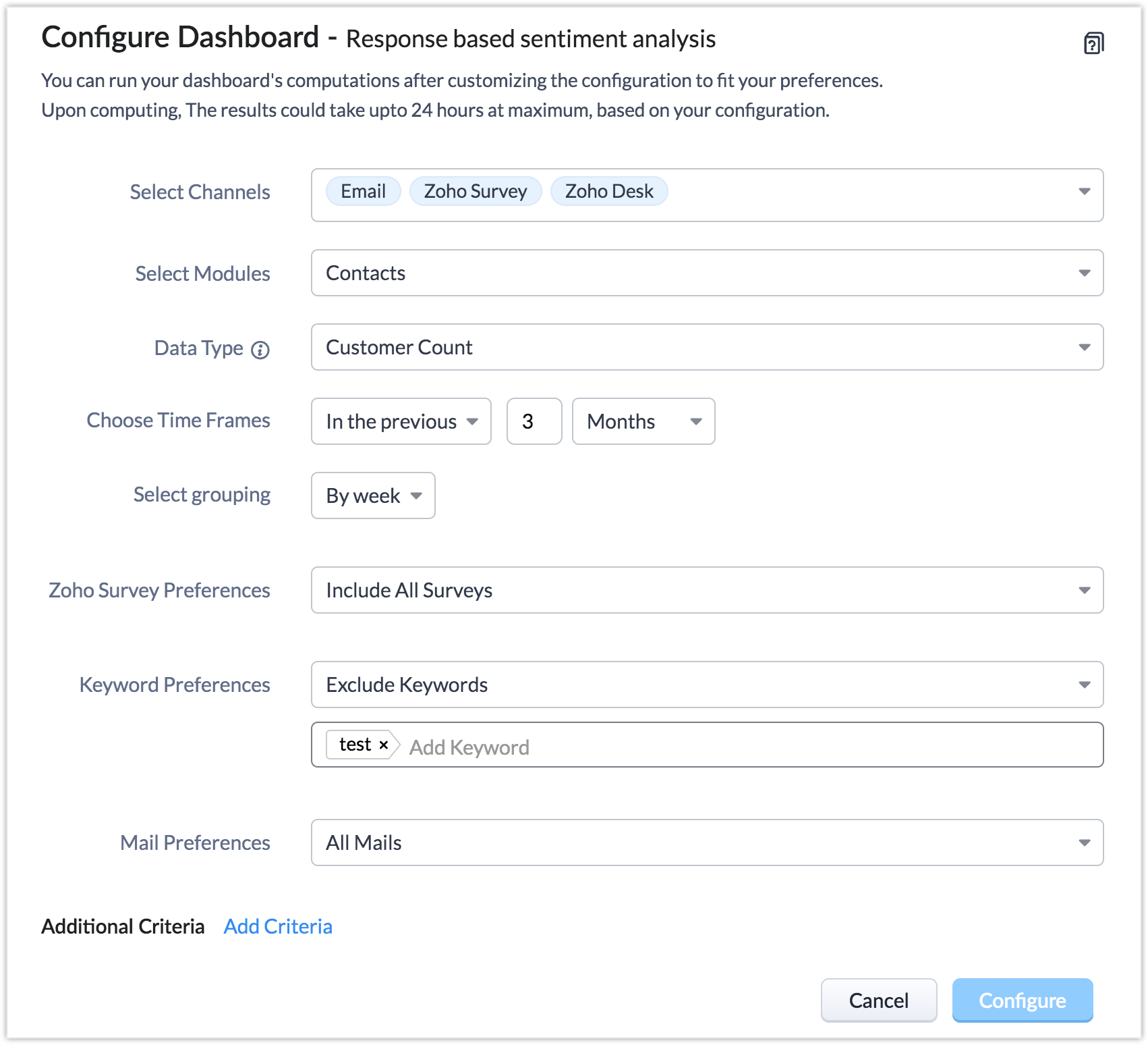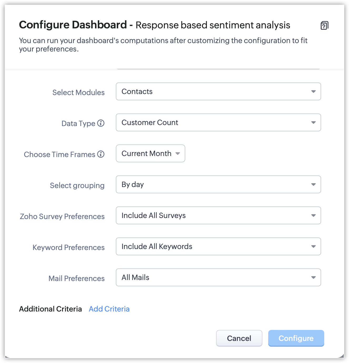 Totuși, există grafice precum Keyword Quadrant, Deals Lost After Receiving Negative Sentiment și altele, pentru care datele sunt preluate nu doar din modulul principal (Contacts) ci și din modulul de vânzări asociat (Deals).
