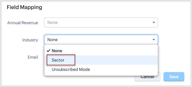 Dacă urmărești industriile într-un modul personalizat numit "Sector", poți mapa câmpul personalizat necesar în dreptul câmpului implicit menționat "Industry".