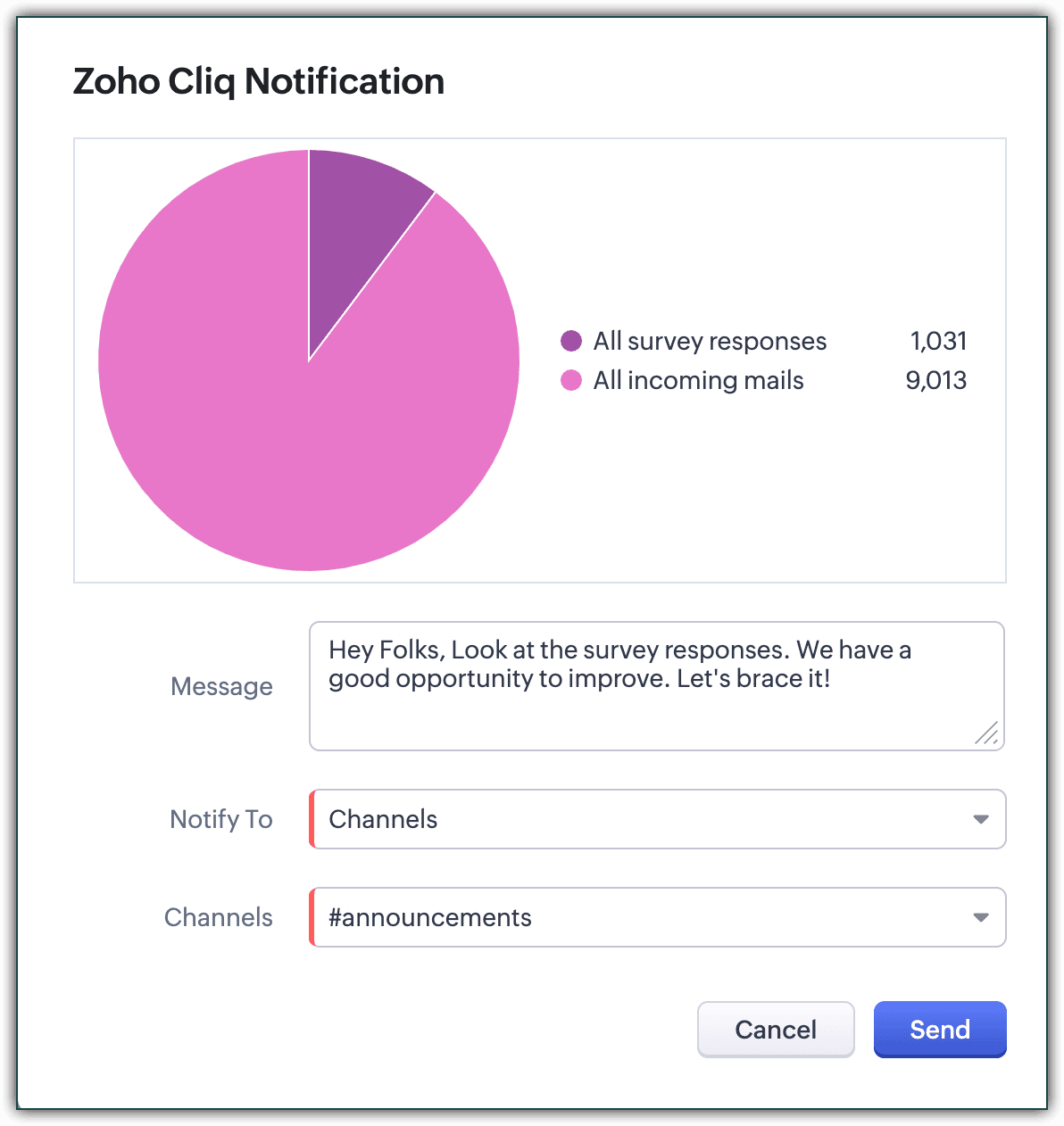 Share îți permite să distribui graficul prin Zoho Cliq, Slack, Cisco WebX, MS Teams și Google Chat ca mesaj direct. Poți introduce mesajul și notifica utilizatori individuali și canale.