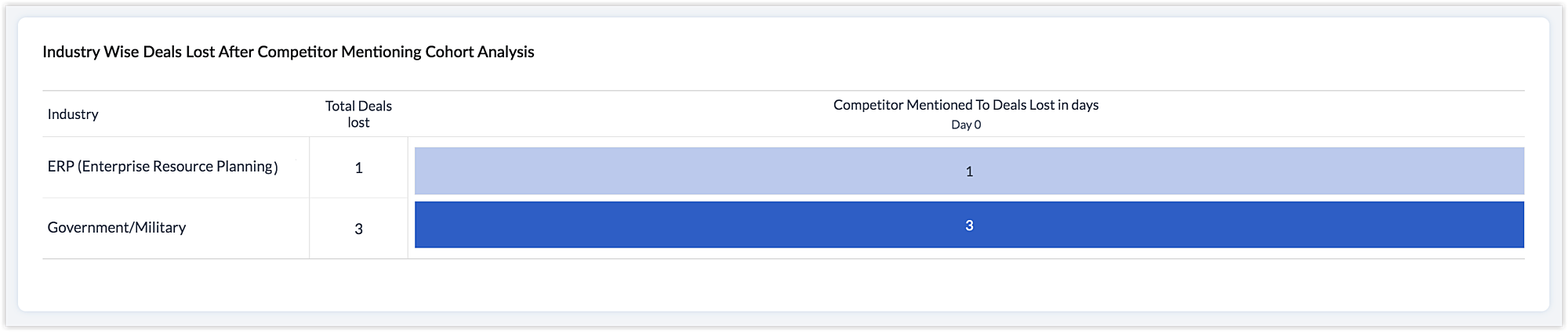 Fiecare dashboard VoC din Zoho CRM, după cum probabil știi, este conceput pentru a-ți oferi o perspectivă specifică. De exemplu, ia în considerare următorul grafic de cohortă configurat pentru modulul Contacts. Acest grafic oferă informații despre tranzacțiile pe care le-ai pierdut la scurt timp după ce clienții tăi au menționat unii dintre concurenții tăi. Aceste informații sunt reprezentate pe industrii și pe o perioadă de timp. De exemplu, conform graficului de mai jos, ai pierdut 3 tranzacții de la clienți aparținând industriei Guvernamental/Militar în prima zi de la menționarea unui concurent.
